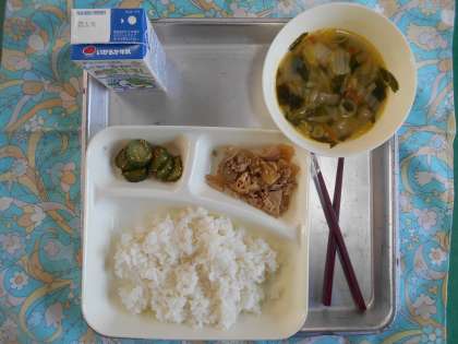 豚肉のコチジャンいため、鶏肉とはるさめのスープ、もやしのナムル風、ご飯、牛乳