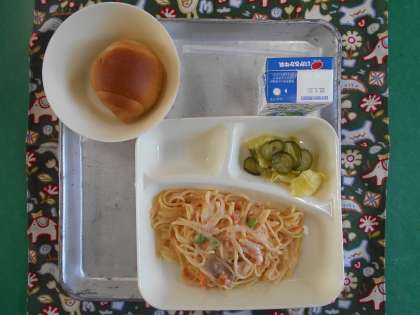 さけのクリームスパゲッティ、キャベツときゅうりのサラダ、黒糖パン小、牛乳