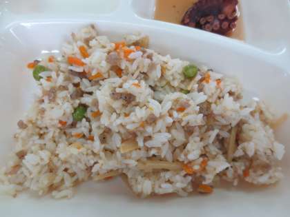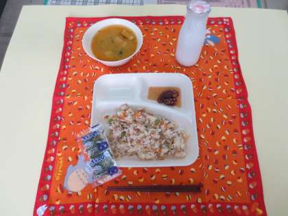 豚挽き肉、こんにゃく、たけのこ、にんじん、グリンピースを甘辛く煮込んだものを炊き上がったご飯に給食室で混ぜています。しょうゆ味のまぜご飯です。