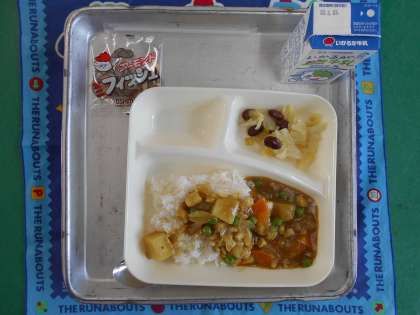 チキンカレーライス、ビーンズサラダ、アーモンドフィッシュ、牛乳