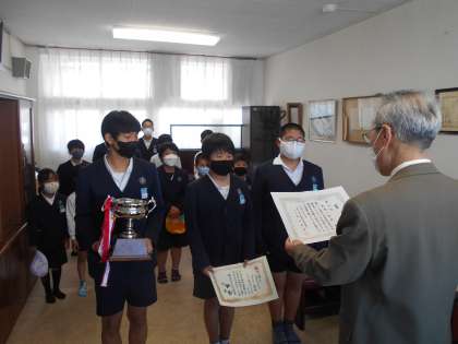 第1回青空杯の「優勝」と区青少年親善大会3位の賞状が、それぞれ校長先生から代表児童に授与されました。大きな優勝カップもあります。