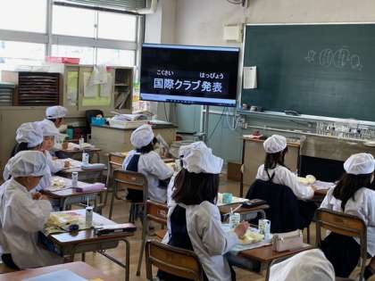 給食の時間に、国際クラブの代表児童が、「発表会の開会」と「頑張って練習した発表会の動画をぜひ見てください」と放送で伝え、録画したビデオを流しました。