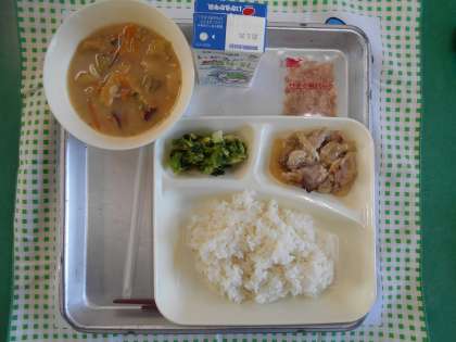 豚肉のしょうが焼き、さつまいものみそ汁、なのはなのおひたし、ご飯、牛乳
