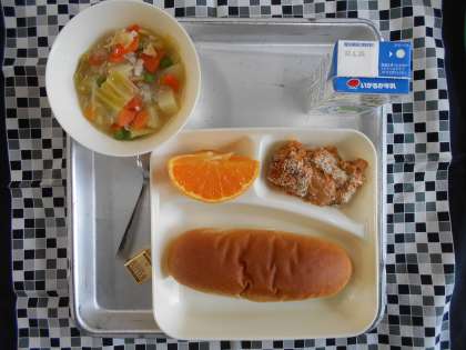 とうふのミートグラタン、押麦と野菜のスープ煮、デコポン、コッぺパン、バター、牛乳