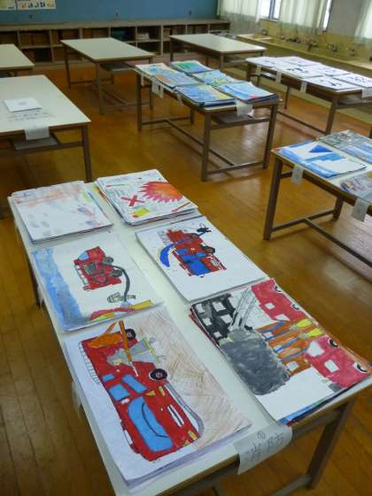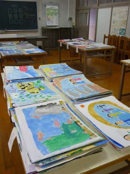 夏休み中に仕上げた絵画や書写の作品を子ども達はたくさん持ってきました。短時間で仕上げたようなものもあったのですが、とてもていねいに時間をたくさんかけて仕上げたであろうと思われる作品も・・・。