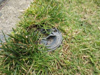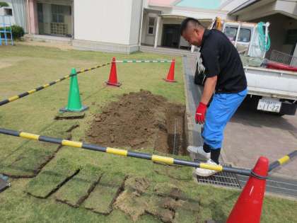 運動場の緑化委員会アドバイザーの尾上さんに来ていただきました。散水機の地下パイプに穴があき、たくさんの水がもれていました。工事を終え、芝生への水撒きができるようになりました。