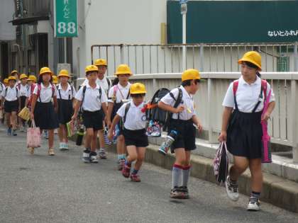 集団登校は6年〜4年の班長・副班長が、みんなに声をかけて安全に歩いています。