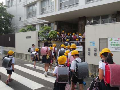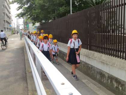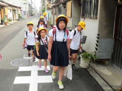 昨日の集団登校の様子です。先頭に班長がいて一番後ろに副班長がいます。