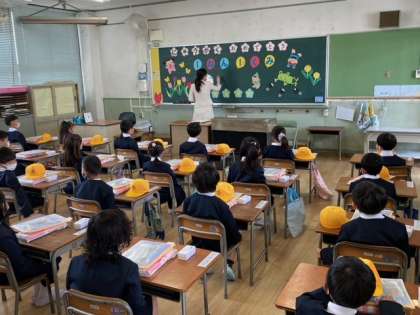 担任の先生から一人ひとり名前を呼ばれ、元気よく返事をしていました。そして、担任の先生のお話を聞きました。