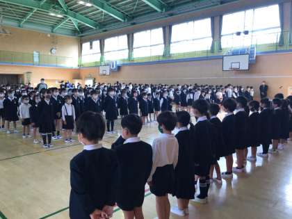 最後に、2年生〜6年生の児童が「校歌」を歌いました。1年生が静かに聴いています。