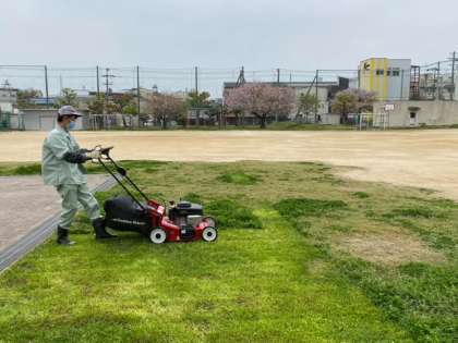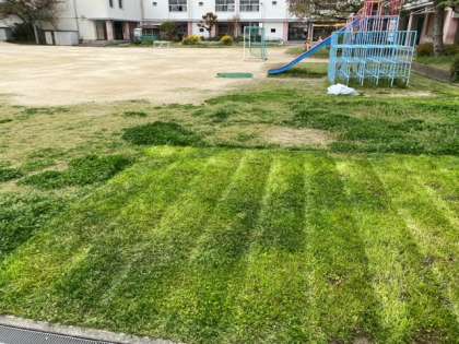 管理作業員さんが、芝刈り機を使って芝刈り作業をしています。すべて終えるには少し時間がかかりますが、子どもたちが気持ちよく遊べるように頑張ってくれています。