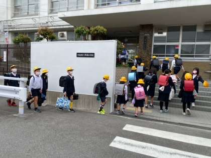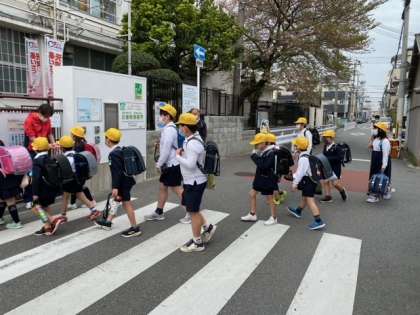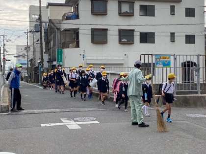 集団登校の子どもたちが、元気よく朝のあいさつをしています。