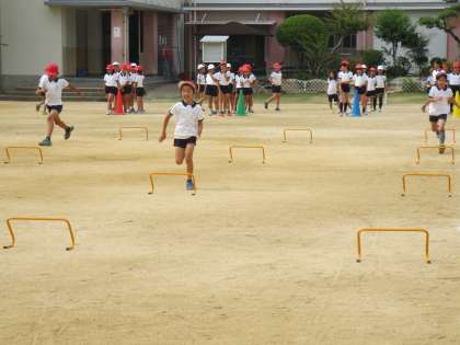 全員でランニングをした後、ハードル間を少しずつ変えて、個々に合ったハードル走をしています。