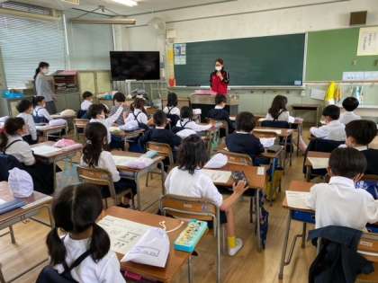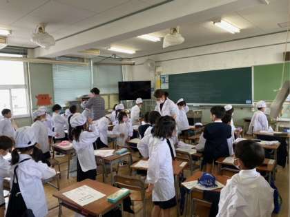 1年生の子どもたちが、栄養指導の先生から給食についてお話を聞きました。