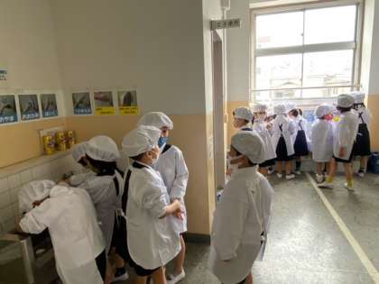 そのあと、エプロンを付けました。担任の先生や支援の先生も手伝ってくれました。手を洗い、給食室へ行きました。とてもお行儀よくできました。