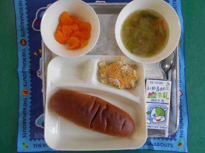 マカロニグラタン、レタスのスープ、みかん(缶)、パン、牛乳