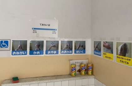 手洗い場には、「おねがい ……」で始まる歌のとおりの 洗い方を掲示しています。