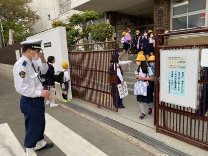 生野警察署の「おまわりさん」に、交通安全指導に来てもらいました。下校する児童に、「交差点や横断歩道できをつけるように」と声をかけてくれていました。