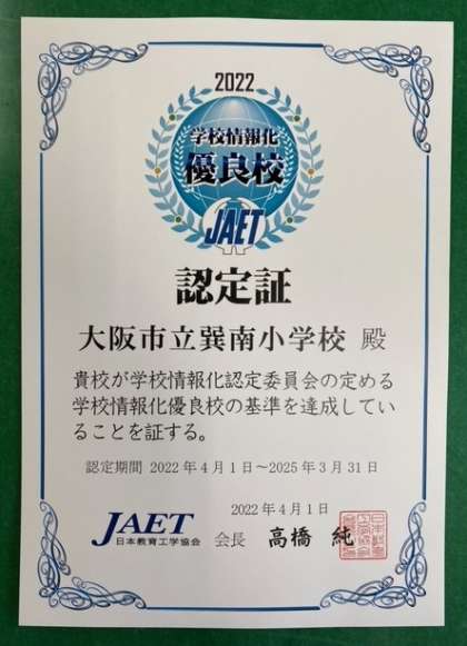 日本教育工学協会(JAET)が行っている、学校情報化認定の「学校情報化優良校(2022年度から2024年度)」を、取得しました。