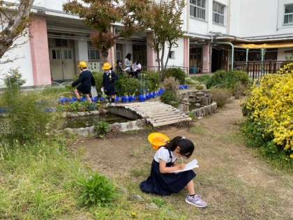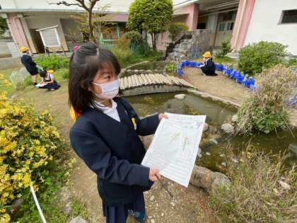 春を探しに外に出ました。子どもたちが、「しろつめ草」や「たんぽぽ」、「モンシロチョウ」などを見つけて、いっしょうけんめいにスケッチしていました。