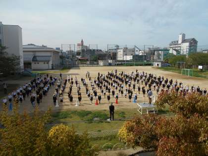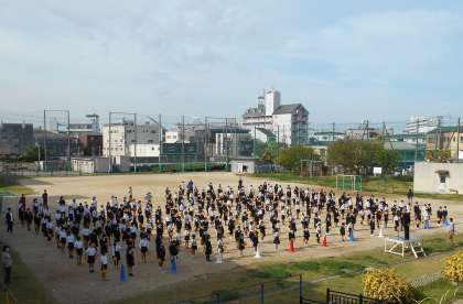 初めての朝会、1年生の子どもたちもしっかりと聞いていました。