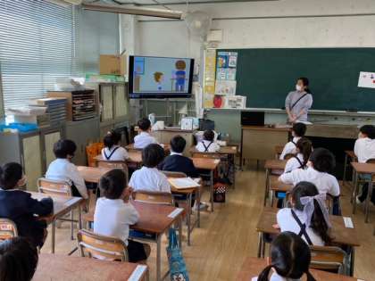 大型テレビの絵を見て、子どもたちも先生のあとについて発音していました。