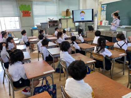 1年生の子どもたちにとって、初めて経験する「English time」、今日は5・6年生の英語を教えている専科の先生が来てくれました。