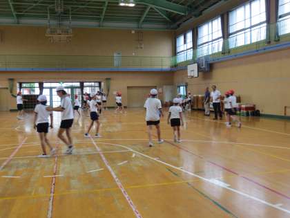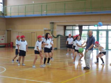 体力テストを終え、ドッジボールをみんなで楽しんでいました。