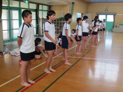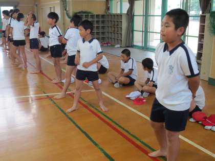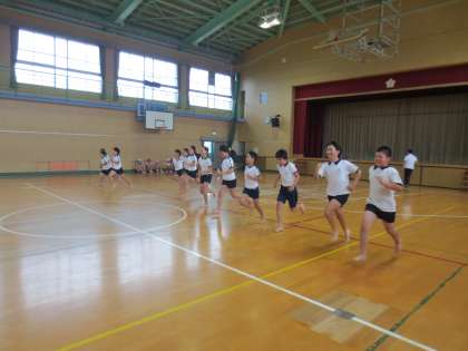 初めのグループがシャトルランに挑んでいます。一定の速度で繰り返し走ります。