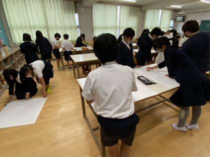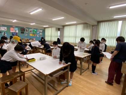 6年生の子どもたちが大きな画用紙に下書きをしています。大きさやバランスなどを考え上手に書いています。