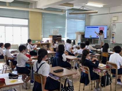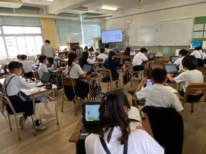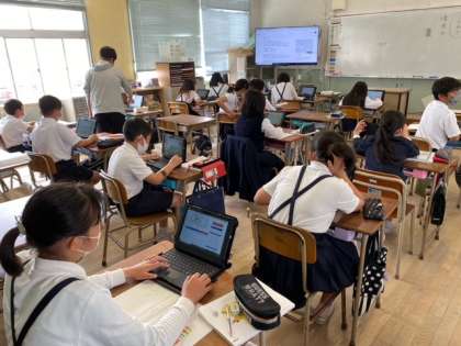 「ことわざと慣用句」について、子どもたちが、タブレット端末を使って調べています。