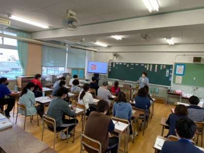 学級活動についての研修を行いました。大学より先生(教授)に講師として来ていただき、学級活動の進め方や話し合い活動についてお話をしていただきました。