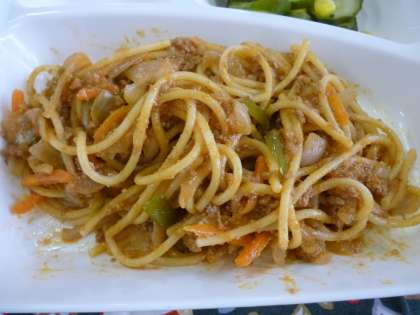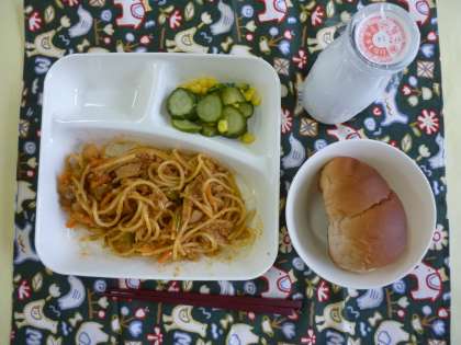 スパゲッティミートソース、きゅうりとコーンのピクルス、黒糖パン小、牛乳