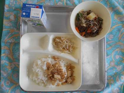 肉じゃが、もやしのゆずの香あえ、ごまかかいため、ご飯、牛乳
