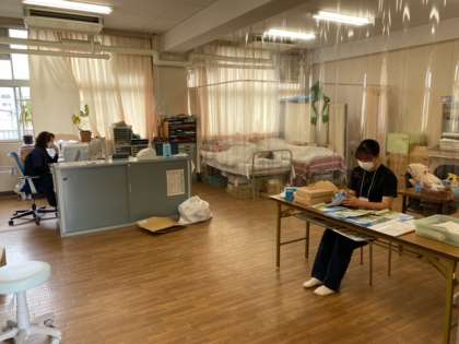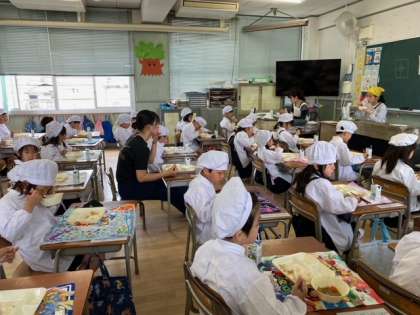 (保健室で養護教諭の仕事を手伝っています。給食は児童と一緒に教室で食べます。今日は1年生です。)