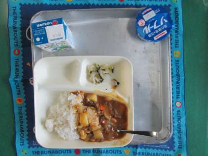 牛肉と大豆のカレーライス、レタスとコーンのサラダ、ヨーグルト、牛乳