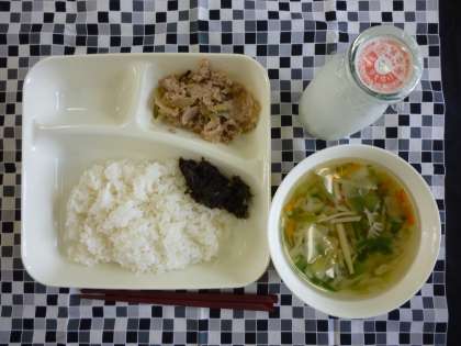 豚肉のごまみそ焼き、すまし汁、のりのつくだ煮、ご飯、牛乳