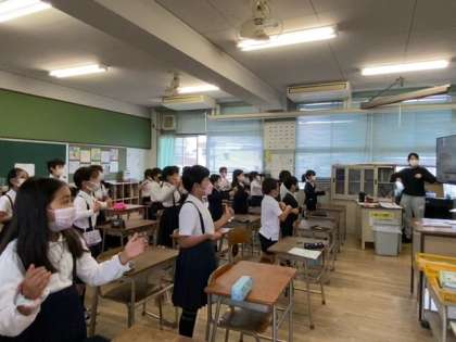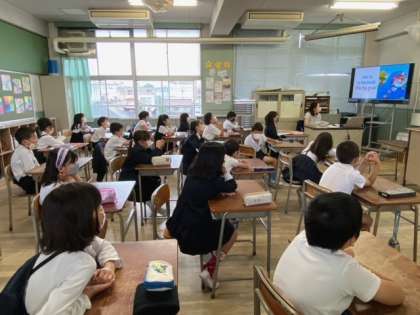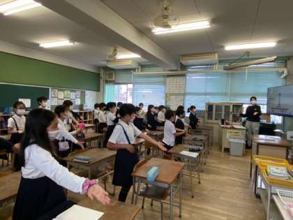 子どもたちが、英語に親しんでいます。2組では、子どもたちと先生が英語の曲に合わせて腕や手を動かしていました。