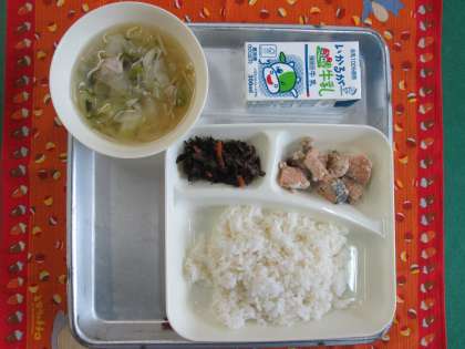 さけのごまみそ焼き、五目汁、ひじきのいため煮、ご飯、牛乳