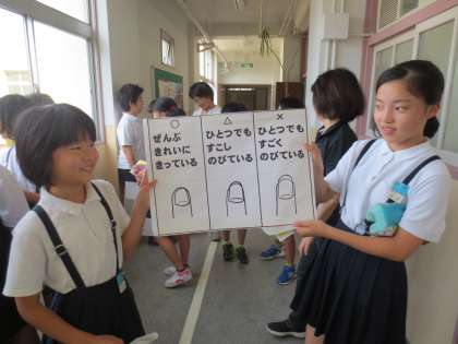 今朝は5・6年の保健委員が1・2・3年の教室へ行って、爪の清潔点検をしました。みんな、自分の爪を見て、伸び過ぎていないかを、しっかり確認していました。
