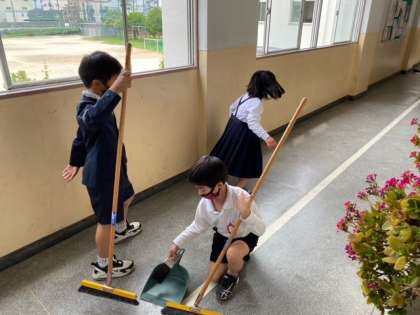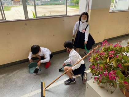 今日も清掃の時間になると1年生の子どもたちが、職員室・校長室前のそうじに来ました。