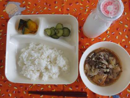 すき焼き煮、きゅうりの酢のもの、焼きかぼちゃの甘みつかけ、ご飯、牛乳
