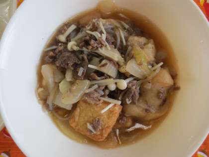 牛肉w主材にあつあげ、糸こんにゃく、たまねぎなどが入ったすき焼きです。