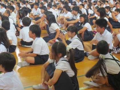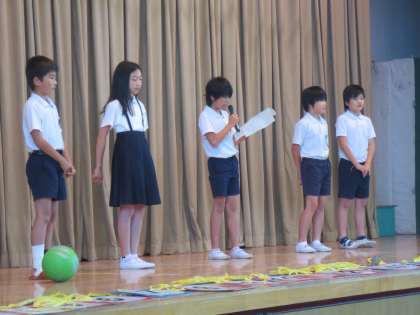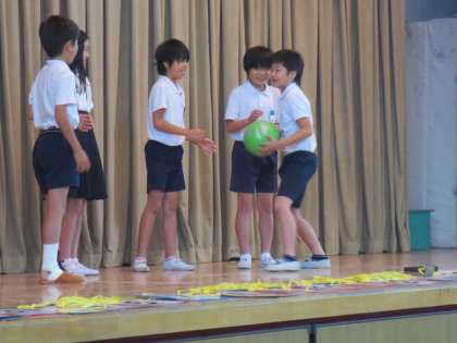今日の集会はバクダンゲームです。同じ数字のたて割り班の赤色と青色が、合同で大きな縦割り班をつくりゲームをします。集会委員会の児童が、わかりやすく説明をしていました。