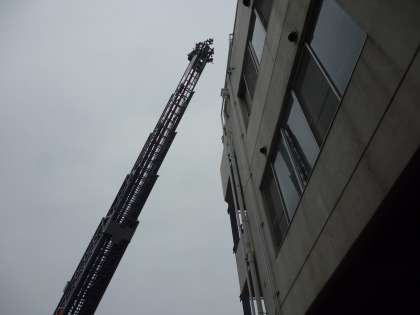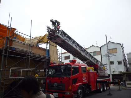 消防隊の人たちが、はしご車を使って、火事で逃げ遅れたビルの屋上の人を救助する訓練を見学しました。はしごの部分が3トンで、はしご車全体で20トンもあるそうです。