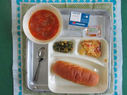 ケチャップ煮、さんどまめとコーンのソテー、りんごのクラフティ、コッペパン、アプリコットジャム、牛乳