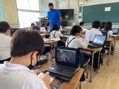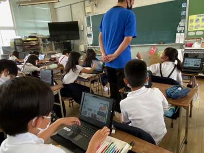 「ヤドカリとイソギンチャク」の関係に興味を持ち、タブレット端末を使って調べ学習をしました。子どもたちが楽しそうに調べていました。
