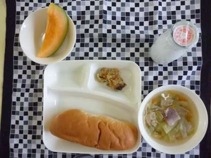 カレードリア、キャベツのスープ、クインシーメロン、レーズンパン、牛乳