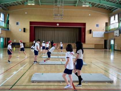 1組の体育科は、体育館で「マット」を使った運動をしていました。