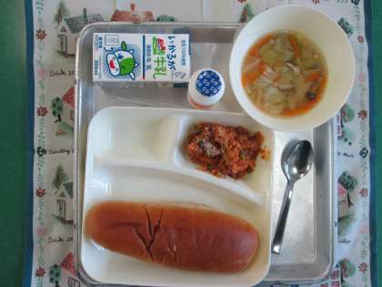 じゃがいものミートグラタン、スープ、発酵乳、黒糖パン、いちごジャム、牛乳